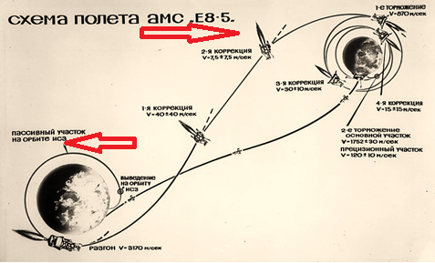Схема полёта АМС "Луна-16"(Е8-5) с обозначением стрелками обратного собственного вращения Луны, как игнорируемого теоретической астрономией факта. Под вопросом стоит и реальность показанной траектории возвращения зонда с лунным грунтом ввиду проблемности взлёта с Луны из-за особенностей её гравитации.