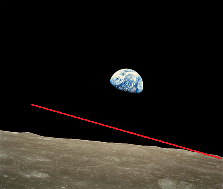 Снимок Земли с лунной поверхности, показывающий наклонный характер лунной гравитации. Красная линия обозначает наклон лунной поверхности и к орбитальной плоскости Земли из-за меньшего угла наклона лунной оси, и к самому лунному горизонту, причём - симметрично.